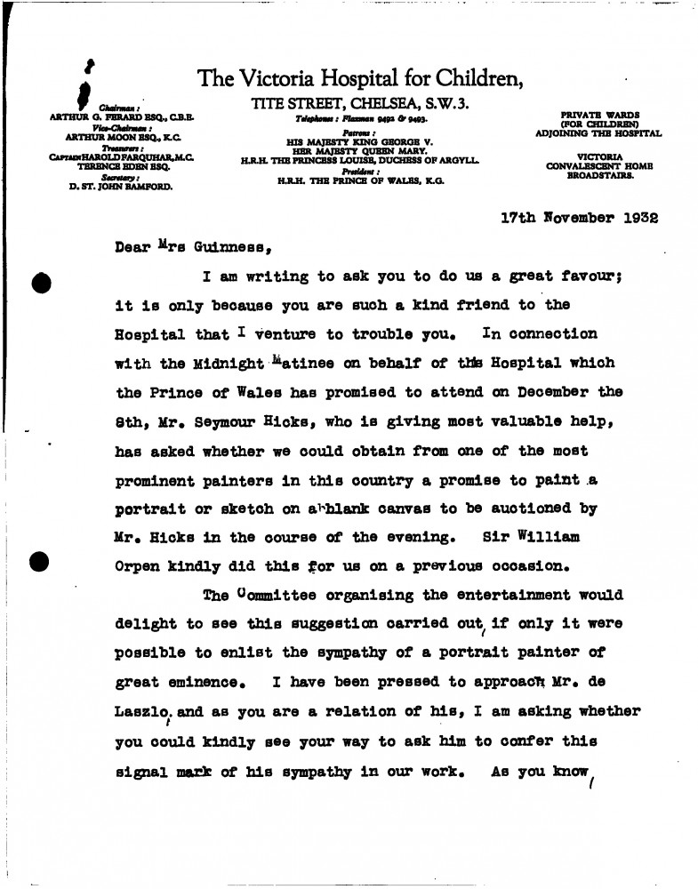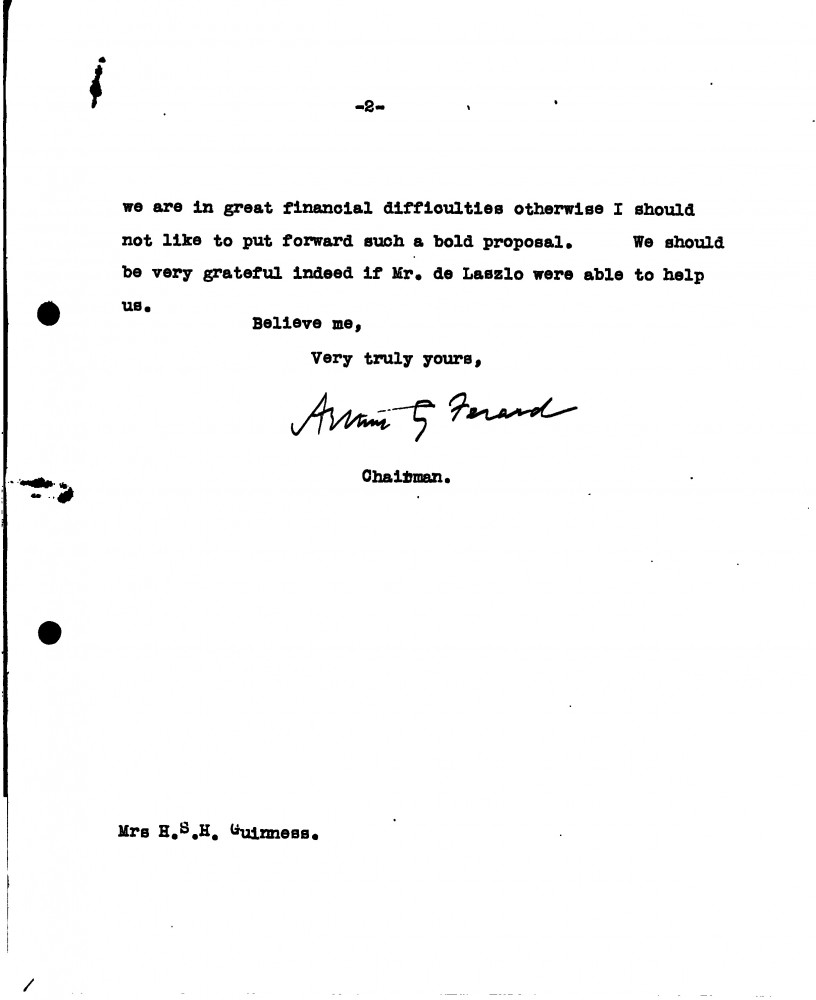 Arthur G. Ferard asks Alfhild Guinness to see if de László, her uncle, would agree to donate a canvas for a charity auction to be held on 8 December 1932 [5012].