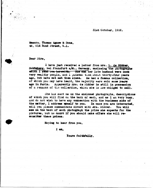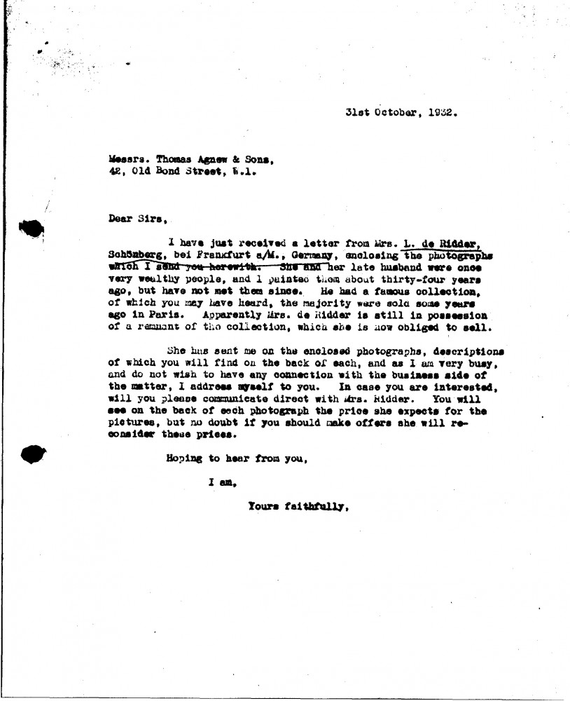 Mrs Louise de Ridder is obliged to sell the remnants of her once-famous art collection. De László asks Thos. Agnew & Sons art dealers to communicate with Mrs de Ridder directly if interested.