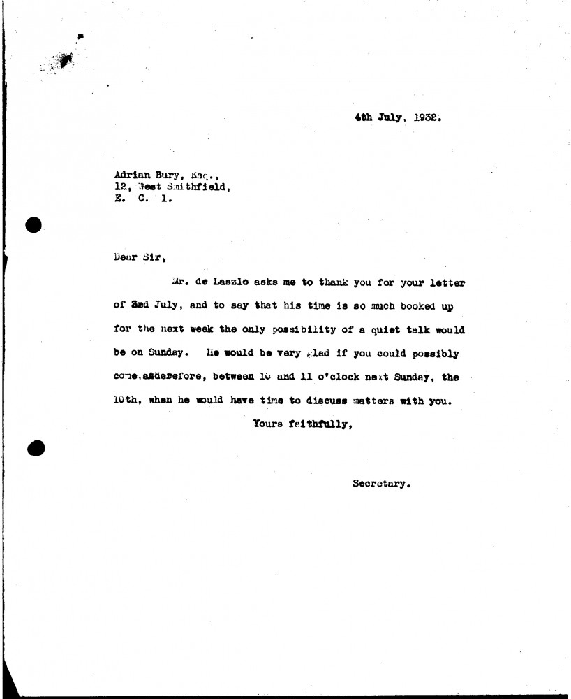 Letter from Adrian Bury to de László, Supplementary Arranged by Years Only 1930-1932, 019-0259