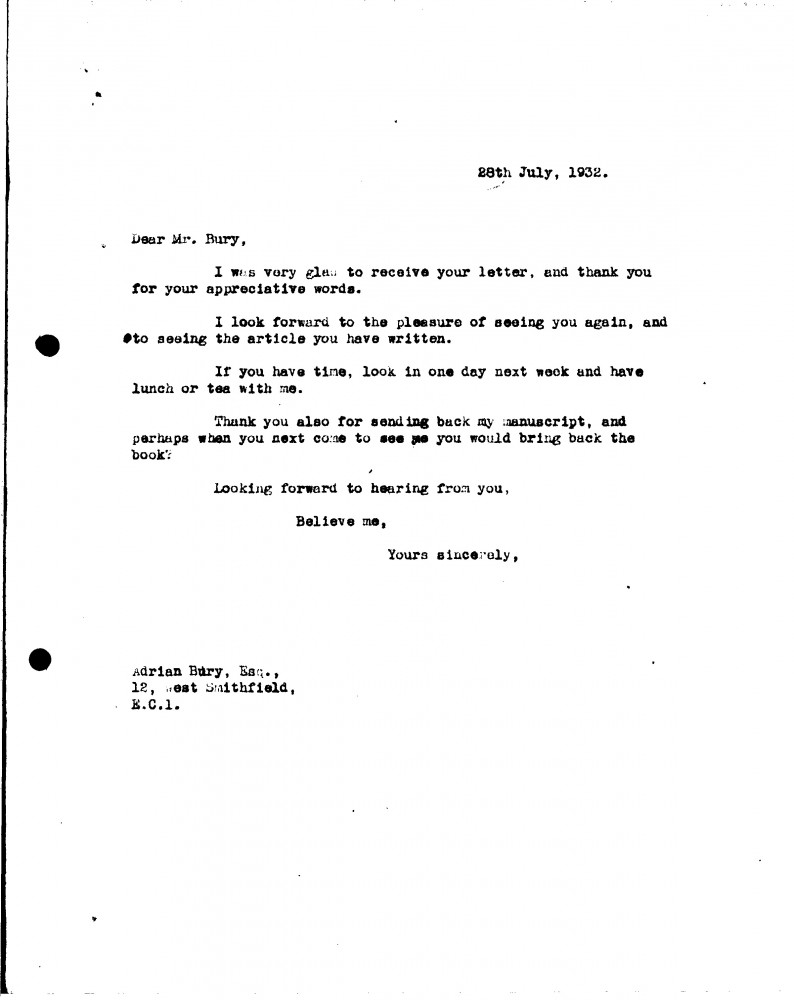 De László looks forward to Bury's article; he invites Bury to lunch/tea.