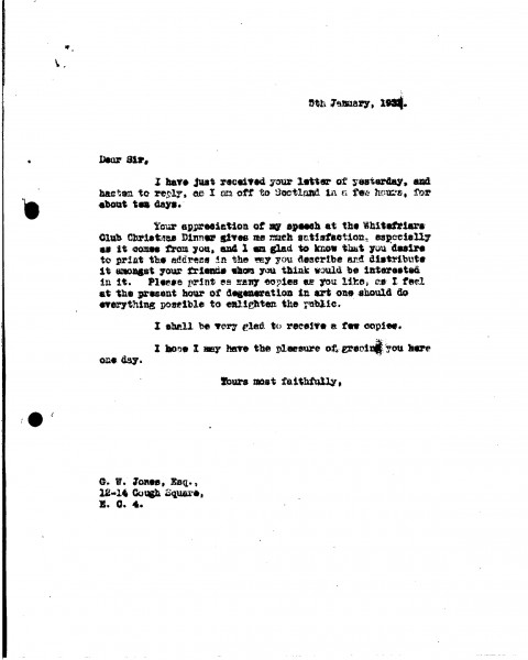 De László was pleased that George William Jones appreciated his speech at the Whitefriars Club Christmas Dinner, and that Jones wishes to print & distribute it to his friends. "I feel at the present hour of degeneration in art one should do everything possible to enlighten the public", de László writes.