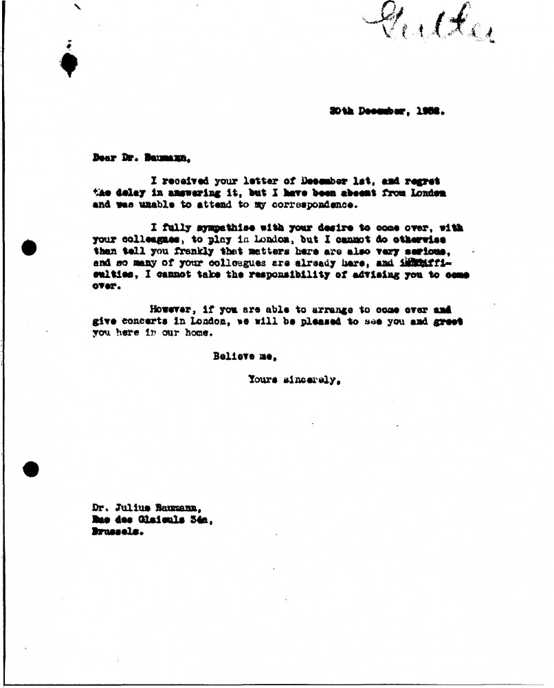 In reply to Baumann's letter (DLA019-0285), de László regrets that he cannot advise the Gertler String Quarter to come to London/provide introductions for them. However, he would be pleased to meet if they do decide to travel over.