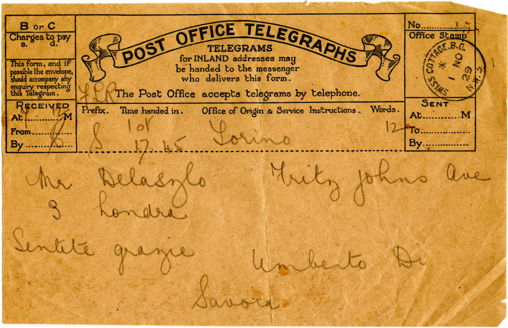 Telegram from Prince Umberto of Savoy (later King Umberto II of Italy) thanking de László.