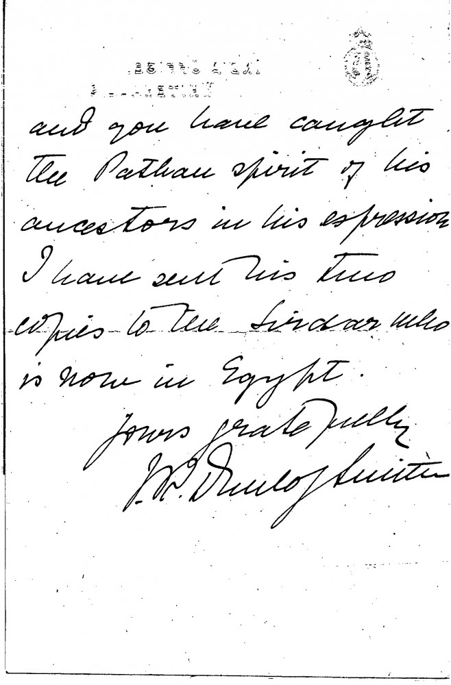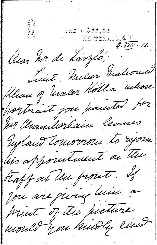 Letter dated 4 August 1916: Lt. Mehar Mahomed Khan is departing for the front; prints of his portrait [1833] are to be sent to James Dunlop Smith for forwarding. Letter dated 19 August 1916: James Dunlop Smith thanks de László for the print and praises the portrait [1833] for capturing the sitter's "Pathan spirit"; copies have been forwarded to the Sirdar in Egypt.