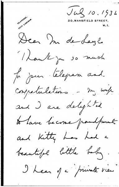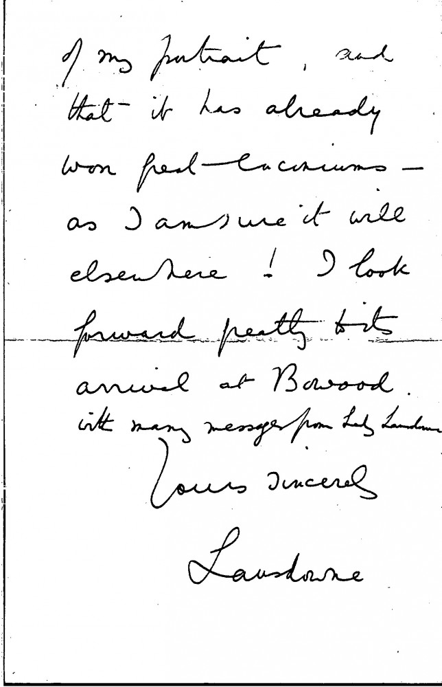 Letter dated 10 July 1934: Lord Lansdowne shares joy at becoming a grandparent and expresses eagerness to see his much-praised portrait [5972]. Letter dated 8 November 1934: Lord Lansdowne sends tickets for the opening of Parliament.