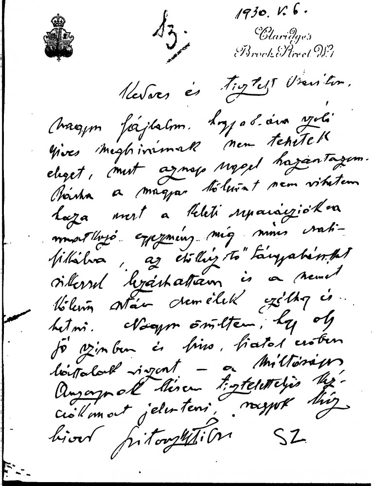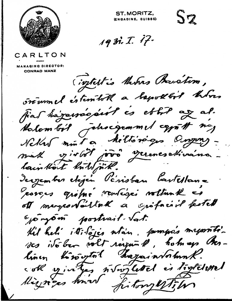 Letter dated 17 January 1931: Scitovszky congratulates de László on the marriage of his son, Stephen. He expresses admiration for a portrait of Comtesse Georges de Castellane [3786] seen in Paris. Travel plans. Letter dated 6 May 1930: Scitovszky declines an invitation due to travel plans. He expresses disappointment at not being able to bring the "Hungarian loan" home owing to pending Eastern reparations agreement.