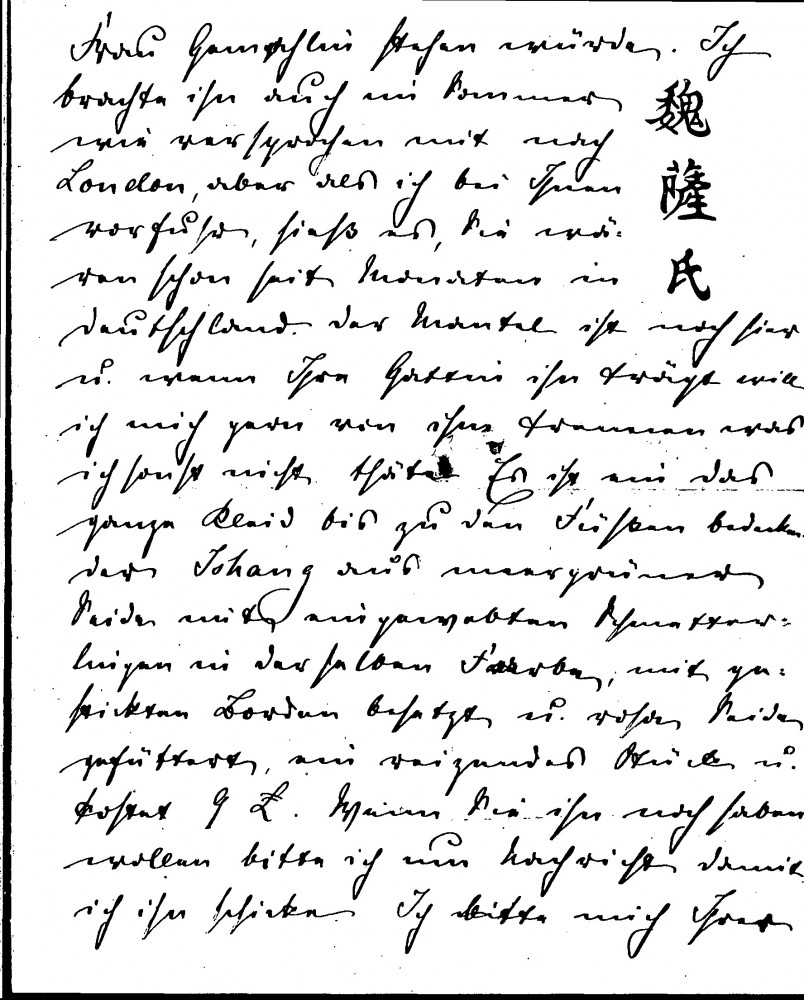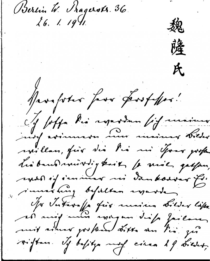Letter from the collector, Olga Julia Wegener, thanking de László for his help with her collection of Chinese pictures and asking if he can assist in securing an exhibition in Hungary. She refers to an earlier conversation with the artist about Chinese garments and she would like to give a green silk coat to Lucy