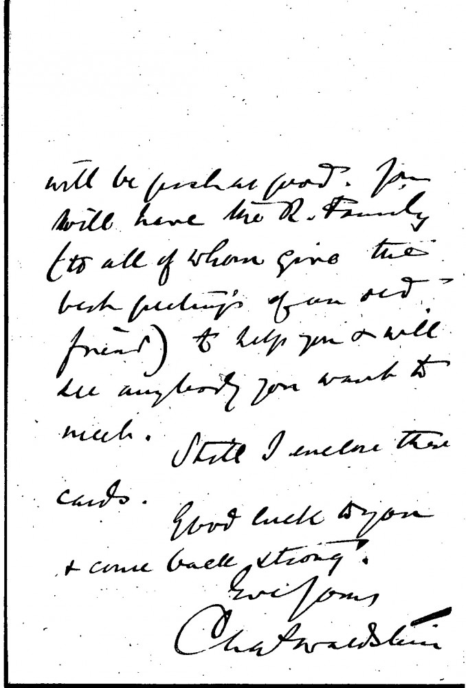 Sir Charles Walston [formerly Waldstein] is happy to hear that de László has recovered from illness and is once again back in London. He is sending on cards (presumably cards of introduction) to the artist, which he can use on his forthcoming trip (de László travelled to Athens two days from the date of this letter)