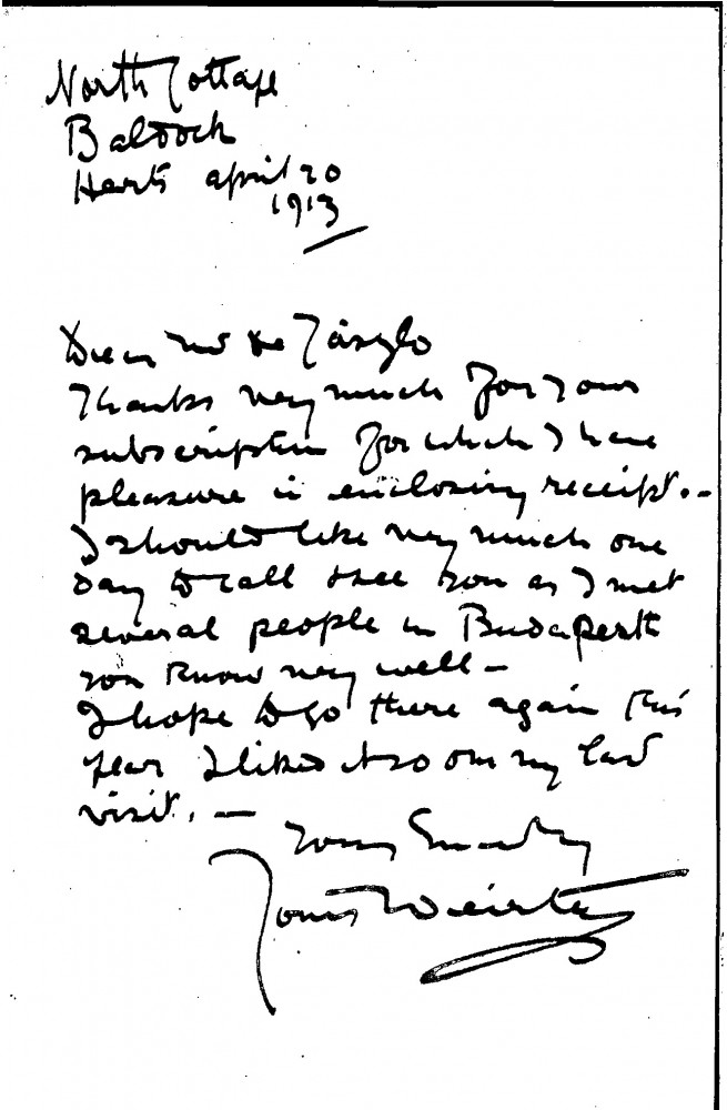 Letter from Louis Weirter thanking de László for the subscription and enclosing a receipt. He would like to call on de László one day as he has met several people in Budapest who know him well