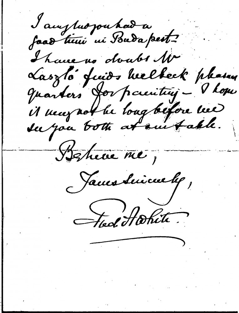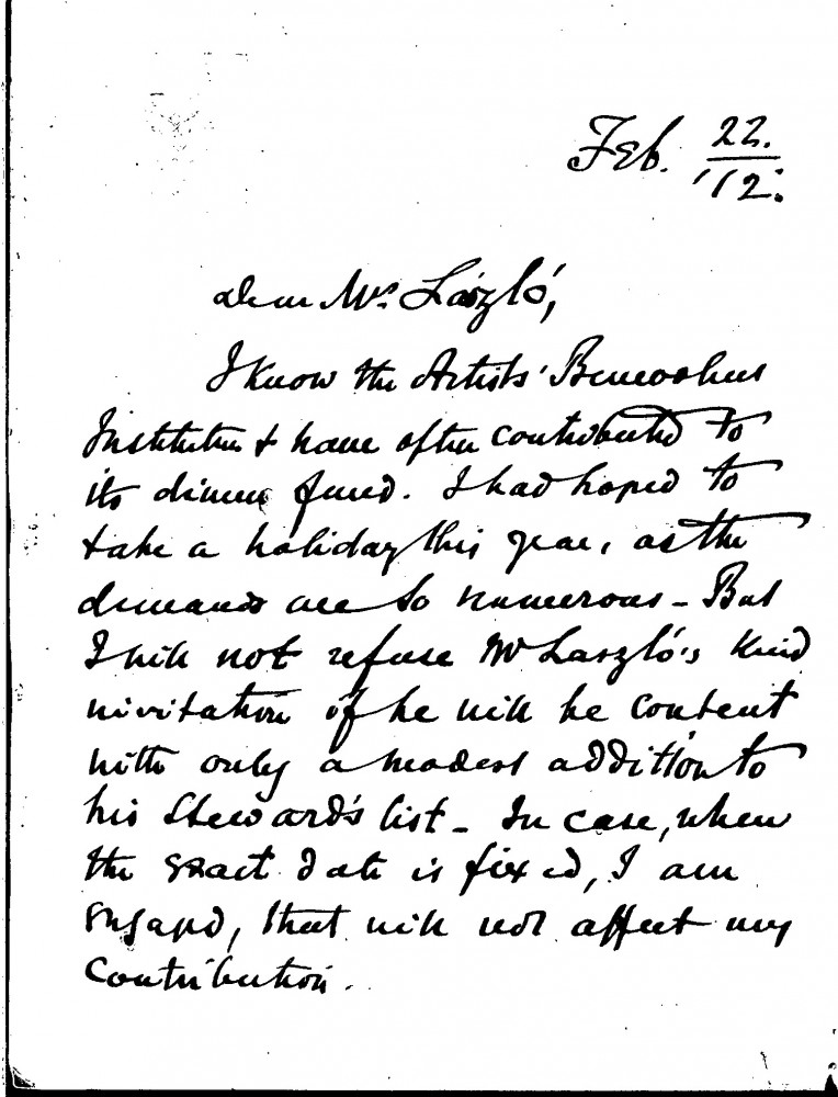 Letter from Frederick Anthony White to Lucy accepting de László's invitation-—despite numerous demands of the year thus far-—to the Artists' Benevolent Fund Dinner. White adds that he has "no doubt that Mr László finds Welbeck pleasant quarters for painting" (de László was, at the time, staying at Welbeck Abbey, Worksop, family seat of the Duke and Duchess of Portland)