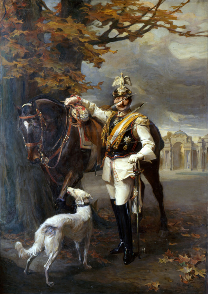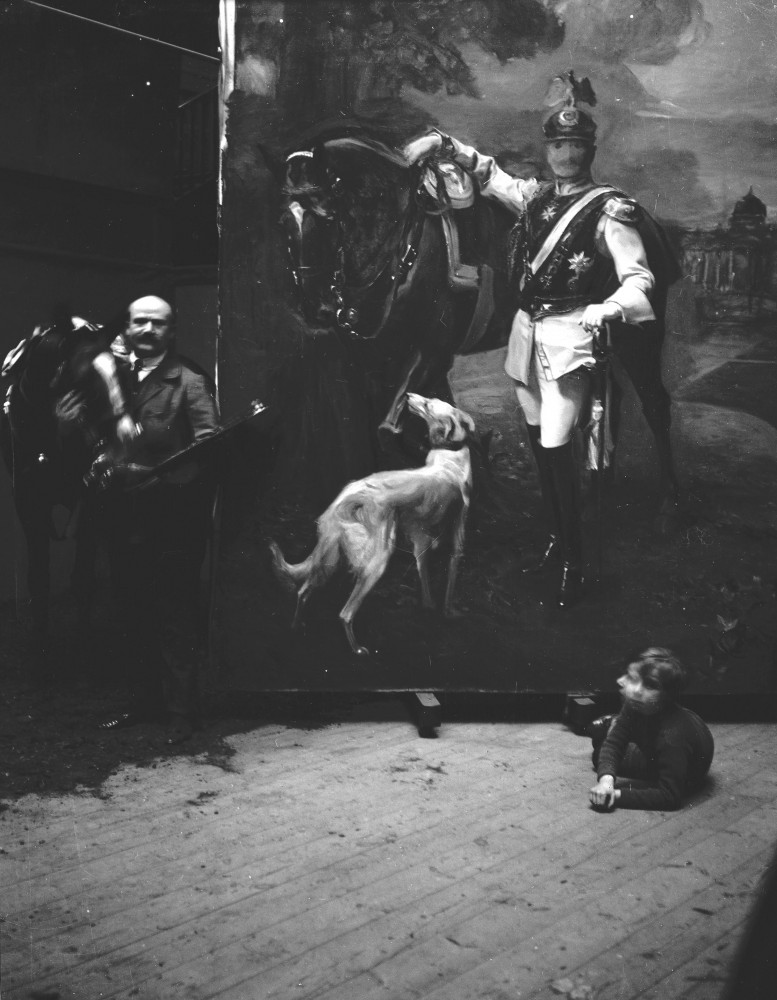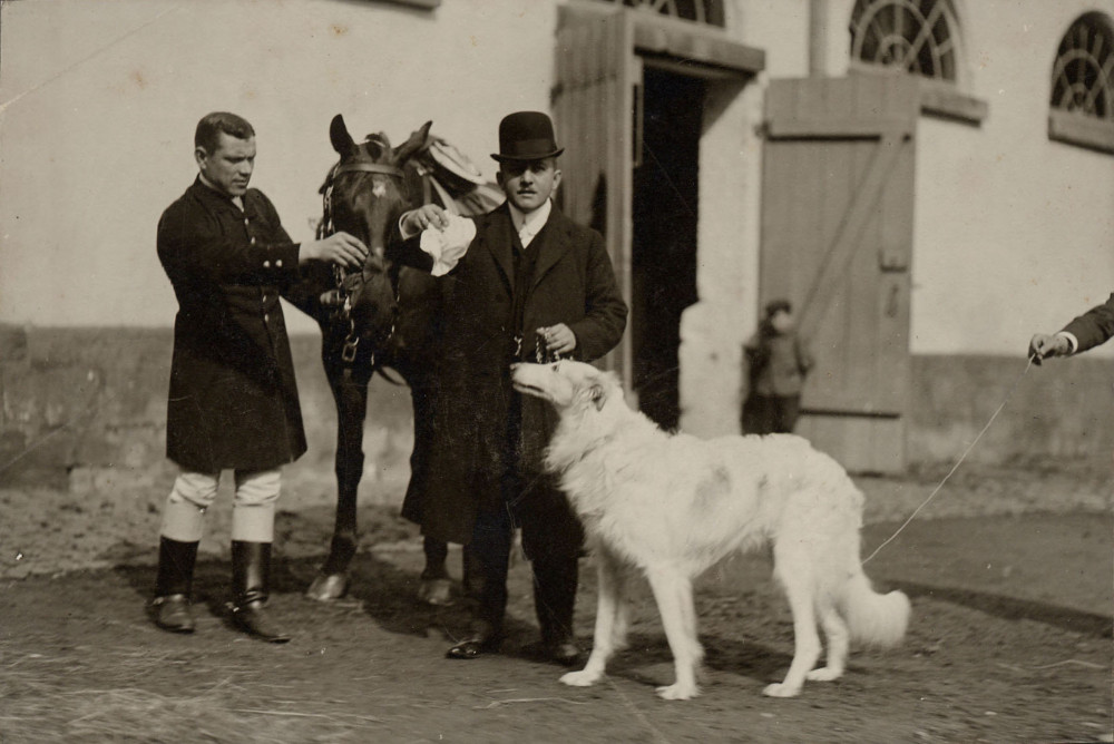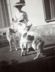 • 1909 c. Princess Viktoria Luise of Prussia with the two borzoi dogs her father the German Emperor Wilhelm II, had chosen for his equestrian portrait, Wilhelmshöhe, Germany