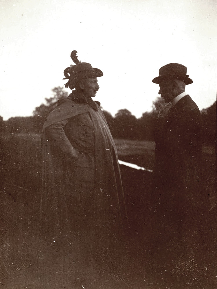 • 1909 c. The German Emperor Wilhelm II, wearing a cloak and hunting hat and a courtier, the park behind, Wilhelmshöhe, Germany