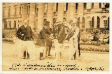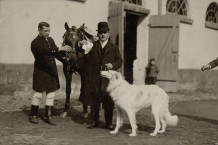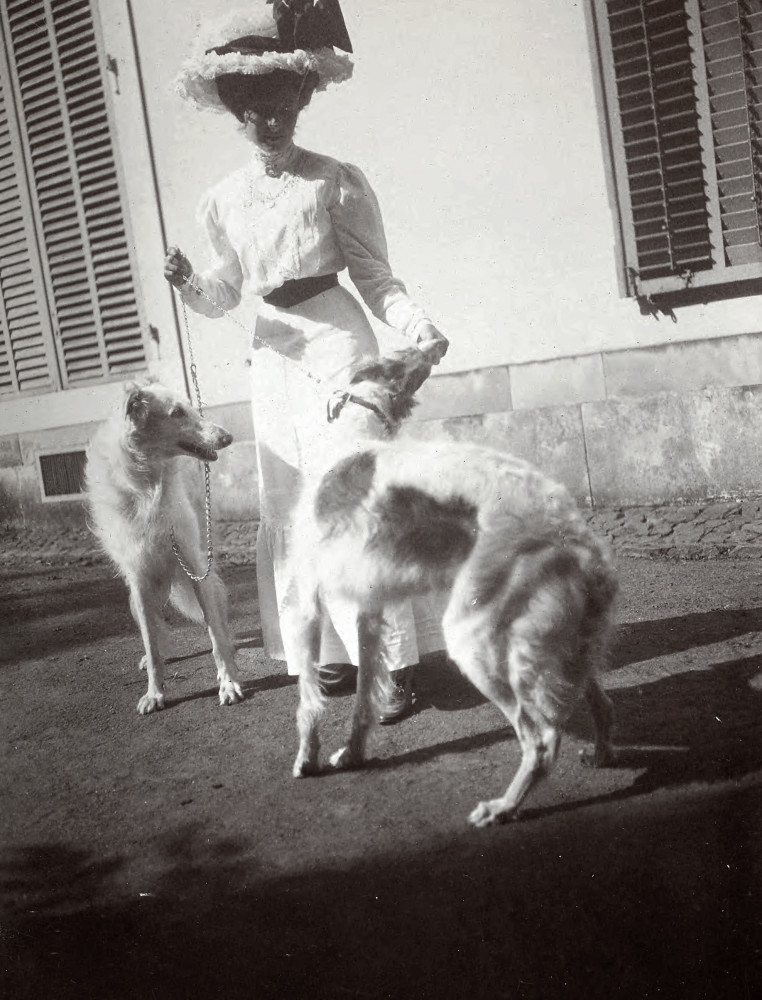 • 1909 c. Princess Viktoria Luise of Prussia holding the two borzoi dogs her father the German Emperor Wilhelm II, had chosen for his equestrian portrait, Wilhelmshöhe, Germany