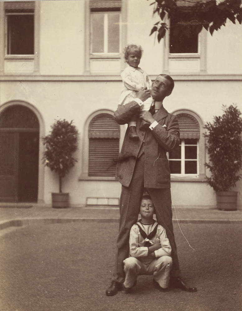• 1907 Prince Andrew of Greece with his eldest daughter, Princess Margarita of Greece and Denmark, and his brother-in-law Prince Louis of Battenberg in front of Heiligenberg Castle, Darmstadt in Hesse
