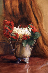 Still Life: Red Geraniums, White Primula and Cyclamen Leaves, in a Two-handled Silver Tankard / 7107
