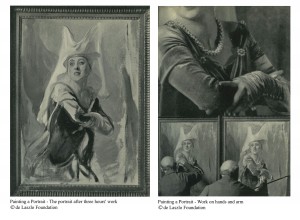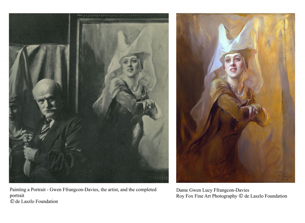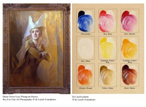 In 1934 de László co-operated on a book about his technique with his close friend, the art critic Alfred Lys Baldry. Painting a Portrait[2] illustrates step-by-step the process of painting a portrait of the actress Dame Gwen Ffrangcon-Davies. Beginning with his palette de László the colours “in the order in which [he] put them on his palette – ultramarine, madder, rose madder, zinc white, light cadmium, dark cadmium, yellow ochre, burnt sienna” and, when needed, “ivory black, Veronese green, Lac garance and orange cadmium.”[3]
