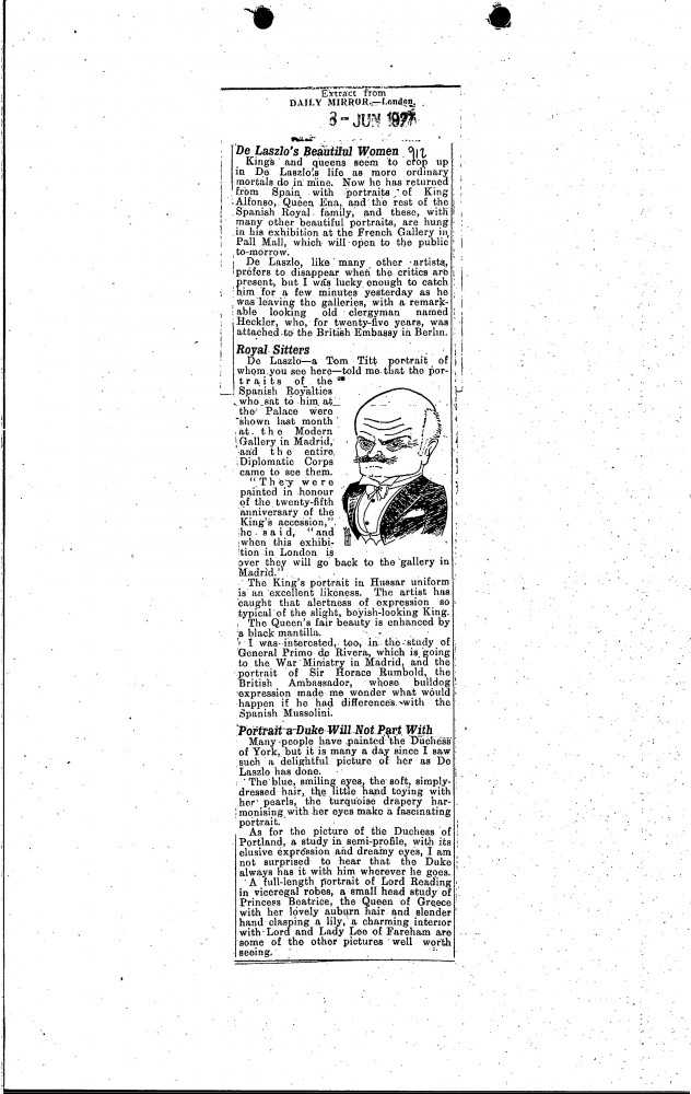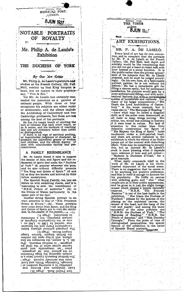 Multiple press cuttings. Morning Post; The Times; Daily Mirror (all dated 8 June 1927) concerning de László's exhibition at the French Gallery. The Morning Post asserts that de László has succeeded the American [Sargent] as a painter of eminent people; The Times offers qualified praise; cartoon of de László illustrates the Daily Mirror cutting.