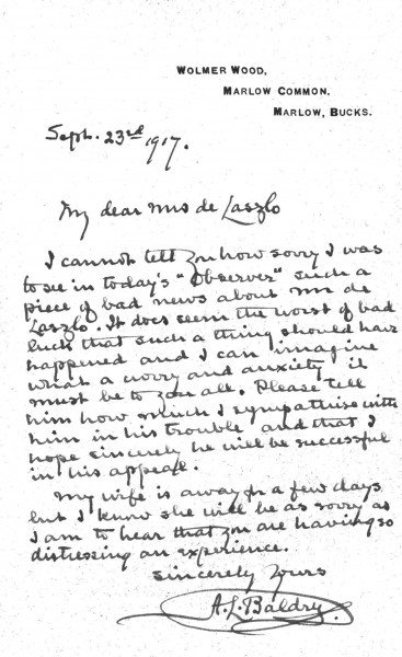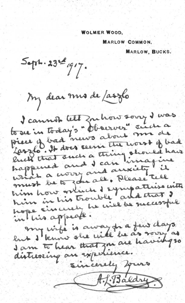 Baldry sends his sympathies to Lucy following de László's recent arrest and imprisonment.