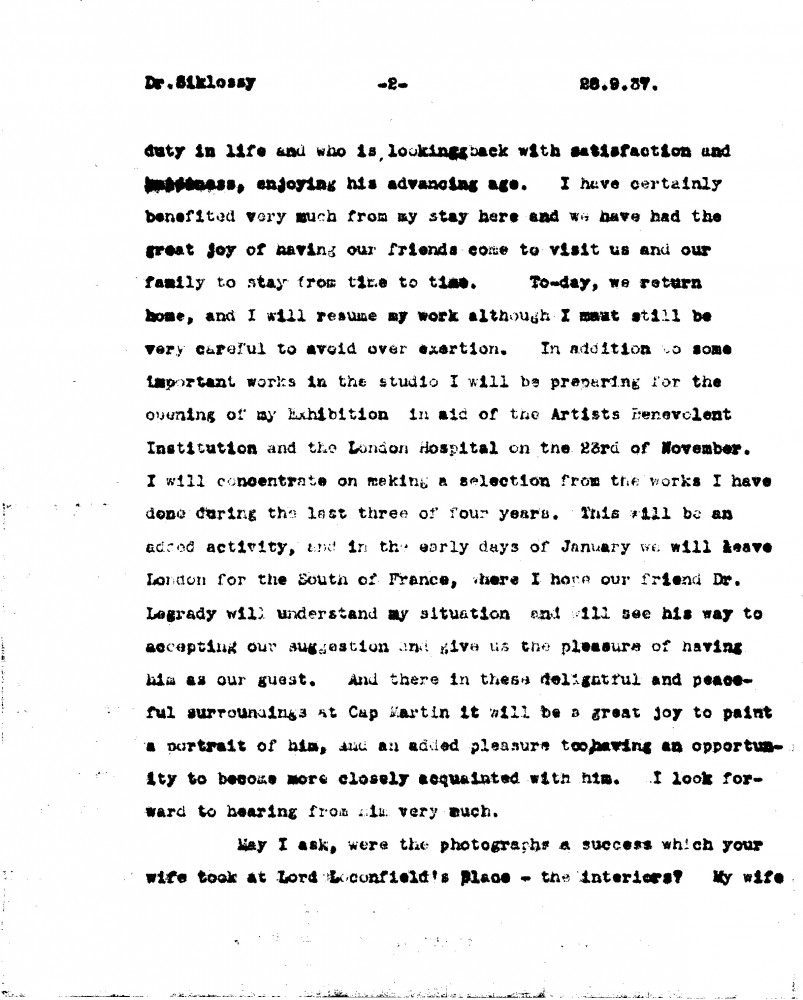 De László thanks Siklóssy for publishing his portrait of the Duchess of Northumberland [6868], promises to send a new studio photograph for the Hungarian Quarterly, and expresses gratitude for photos from Siklóssy’s visit. Reflects poetically on the end of summer, mentions preparations for his upcoming exhibition (Wildenstein, 1937), and notes plans to travel to the South of France to paint Légrády.