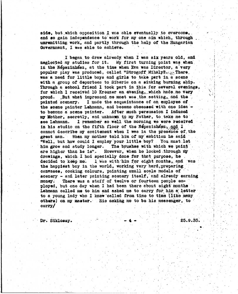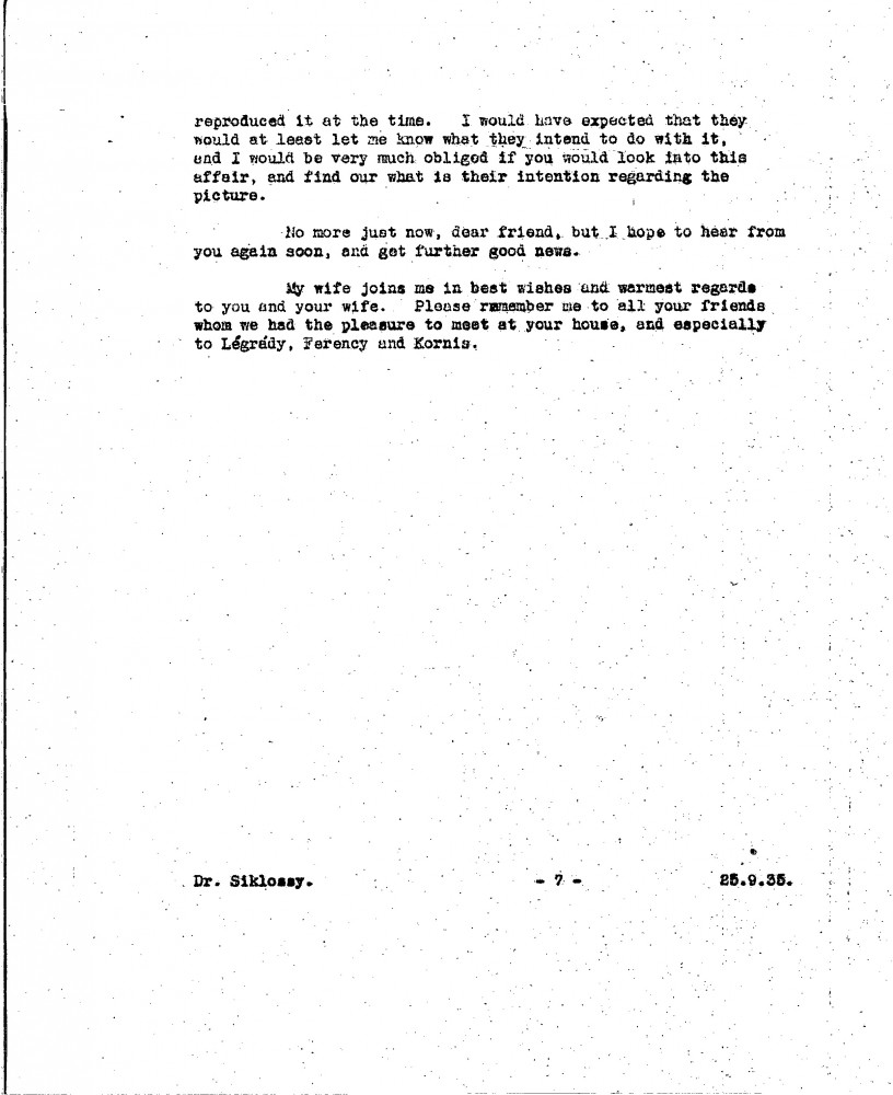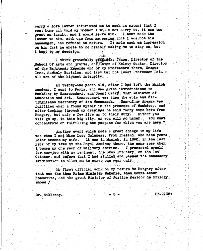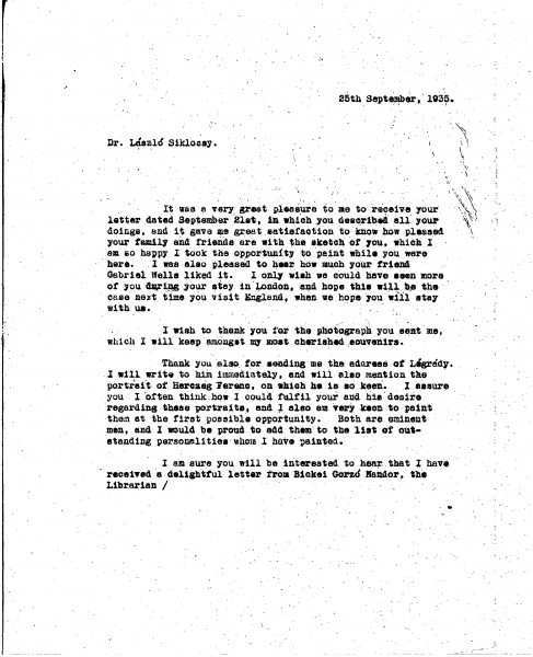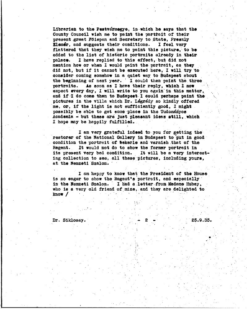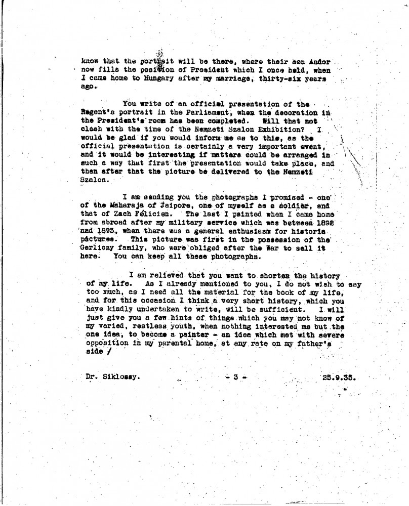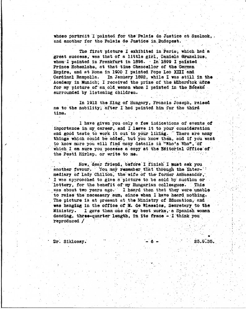 De László is pleased his sketch of Siklóssy [111404] was well received. Discusses the restoration and exhibition of his portraits of Wekerle [possibly 111100] and Horthy [110886]. Mentions a new commission to paint Elemér Preszly. Expresses continued desire to paint Légrády and Herczeg's portraits. Shares autobiographical notes for a proposed Hungarian edition of "Painting a Portrait", recounting early artistic ambitions and career milestones. Asks for help locating a picture [6316] he donated to charity and which remains unaccounted for.