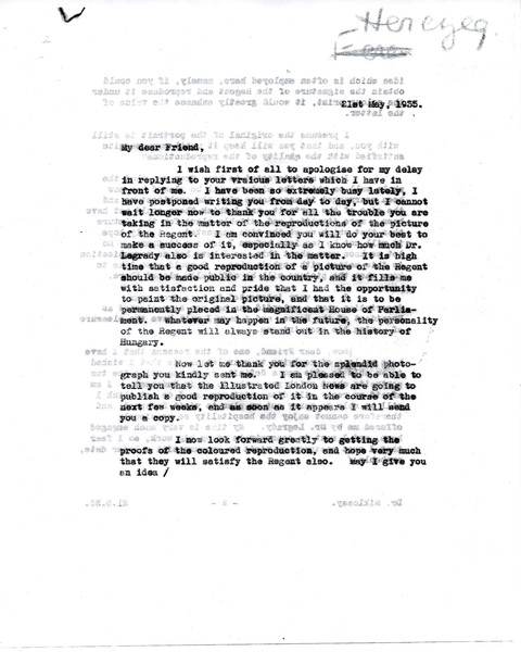De László thanks Siklóssy for help with reproductions of the Regent's portrait [110886]. He proposes painting portraits of Legrady and Herczeg in Paris and outlines his fees and framing preferences.