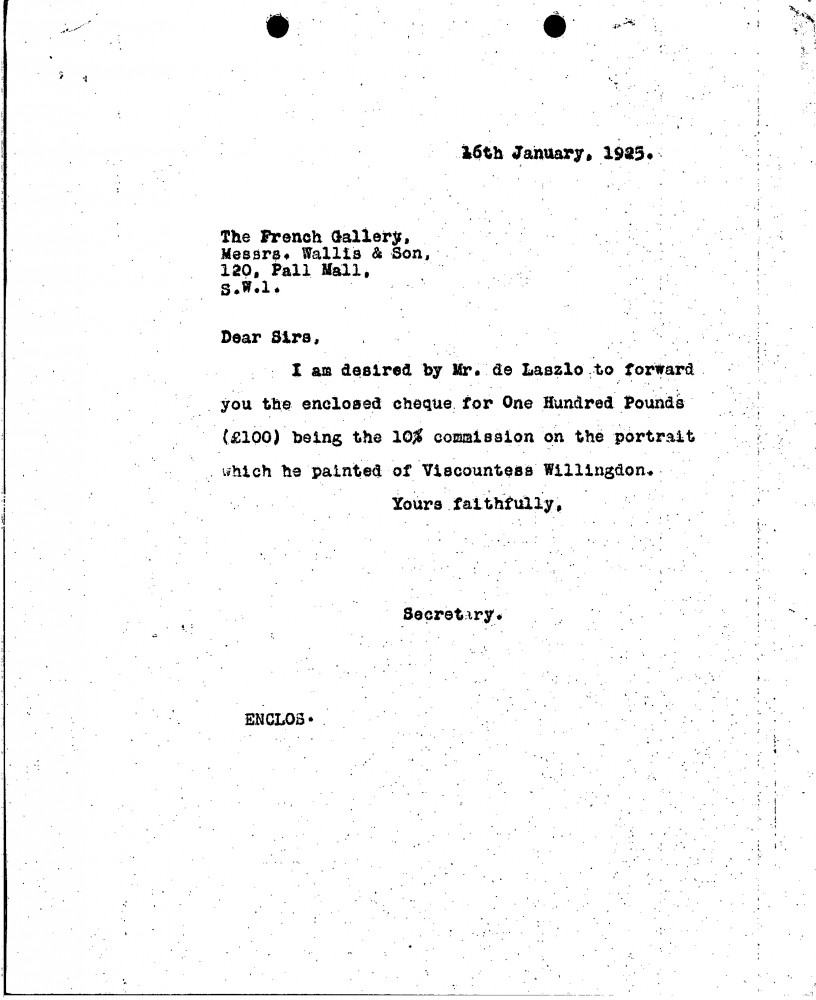 A £100 cheque is enclosed as 10% commission on de László's portrait of Viscountess Willingdon [7755].