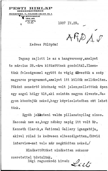 Letter from Dr László Siklóssy to de László, Personal Letters from 1st Jan 1936 to 30th June 1937, 024-0334