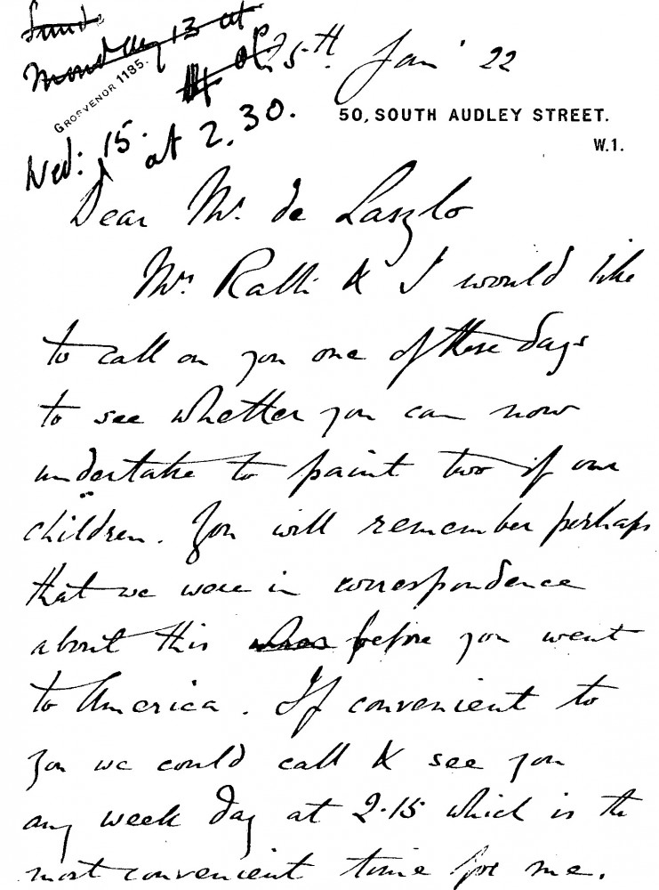 Eustratio Lucas Ralli requests a meeting with de László to discuss the possibility of painting a portrait of his children [2681], referring to earlier correspondence prior to the artist’s trip to America. He mentions an existing portrait by de László of Mrs Smiley [10763] displayed in the house.