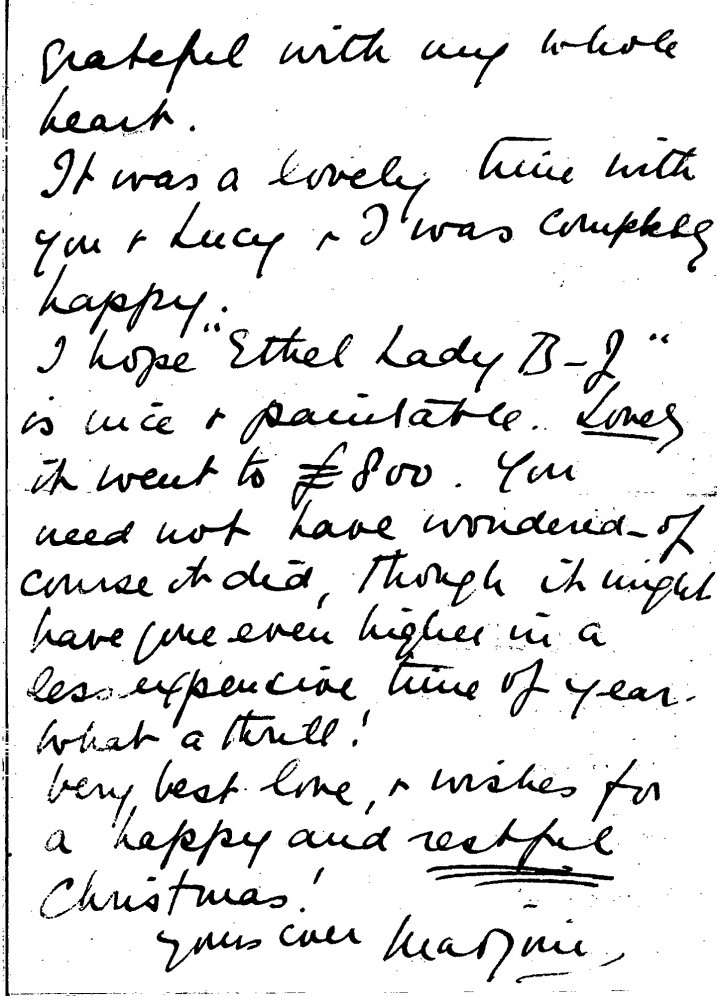 Marjorie Hodge expresses delight and gratitude for her portrait [5647], recounting the praise it has received. She notes the high price achieved at auction for a blank canvas (see fn. 2 in transcription).