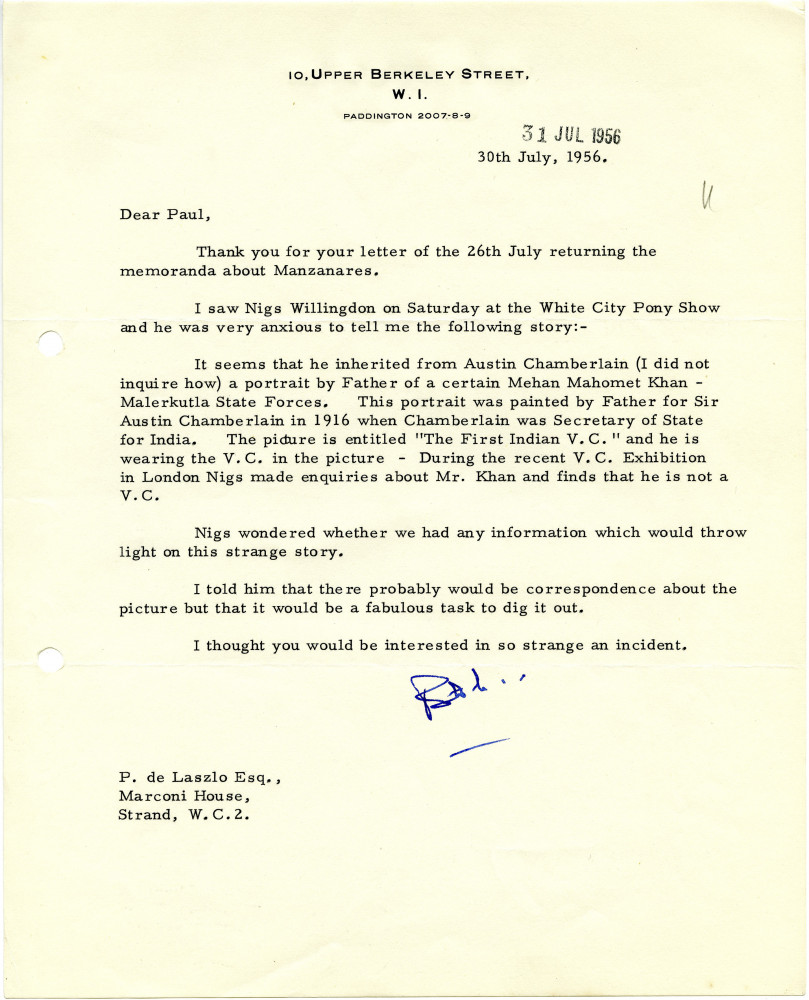 Patrick thanks Paul for returning the memoranda about Manzanares. He reports that Inigo “Nigs” Willingdon has inherited a portrait of Mehar Mahomed Khan [1833] from Austen Chamberlain. He asks whether Paul has any information that might clarify the circumstances surrounding the portrait.
