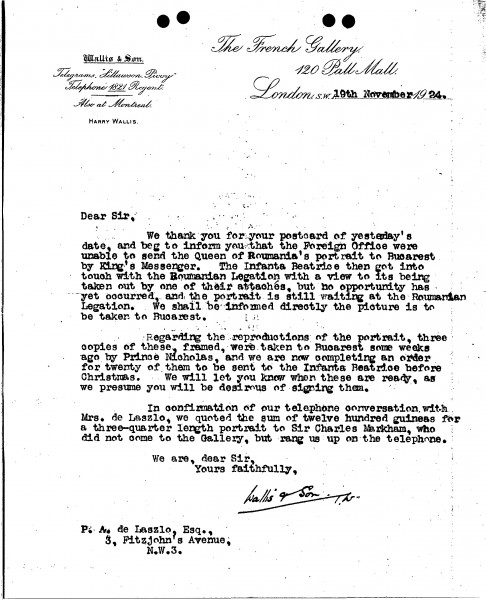 The Queen of Romania’s portrait [3200] remains at the Romanian Legation awaiting transport to Bucharest, while three reproductions have already been taken there and twenty more are being prepared for the Infanta Beatrice. Confirms quoting 1,200 guineas for a portrait to Sir Charles Markham, see [4730].