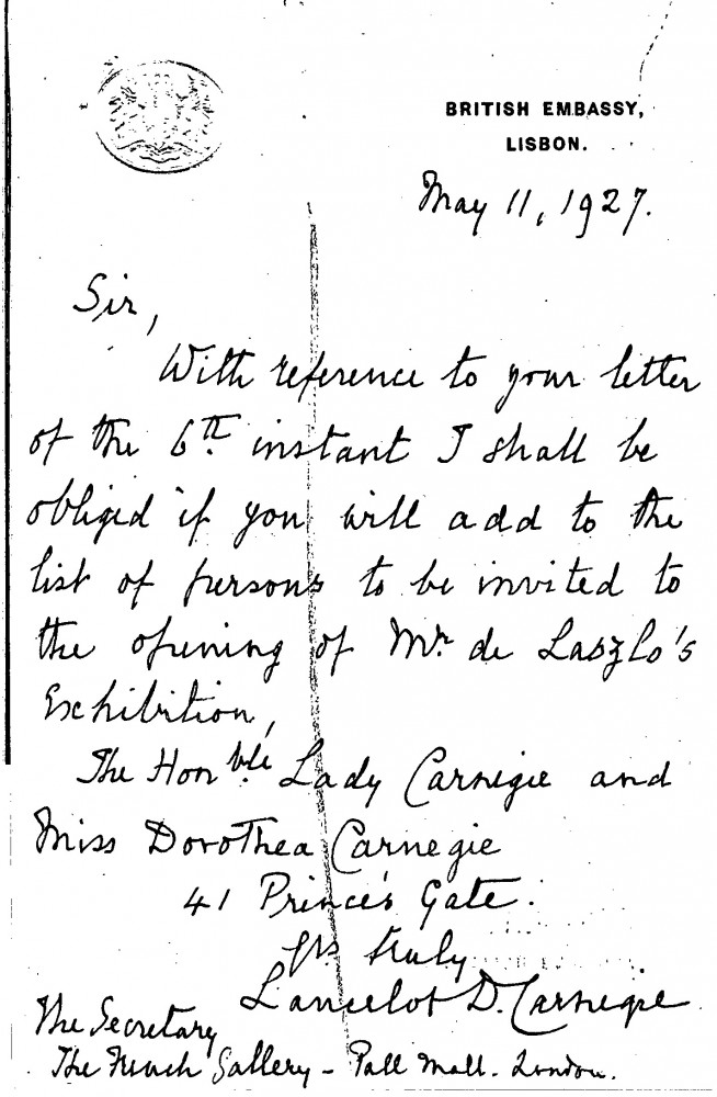 Lady Carnegie and Miss Dorothea Carnegie are to be added to the invitation list for de László's exhibition (French Gallery, 1927) (see also DLA107-0132 and DLA107-0133).