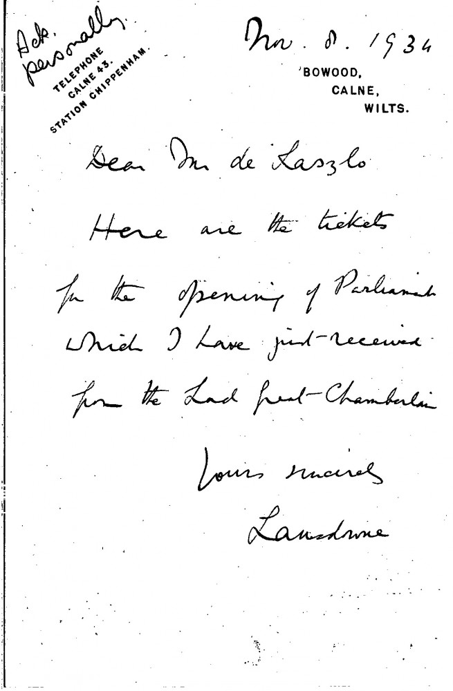 Letter from the 6th Marquess of Lansdowne to de László, Letters Personal 1934 A to M 1935, 022-0374